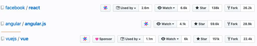 近两年前端技术层出不穷,目前市面上已经有了很多供前端人员使用的开发框架,转眼19年已过大半,前端框架领域日趋成熟,实现了三足鼎立的局面,截止到10月22日,Angular,react和vue数据统计如下图所示: