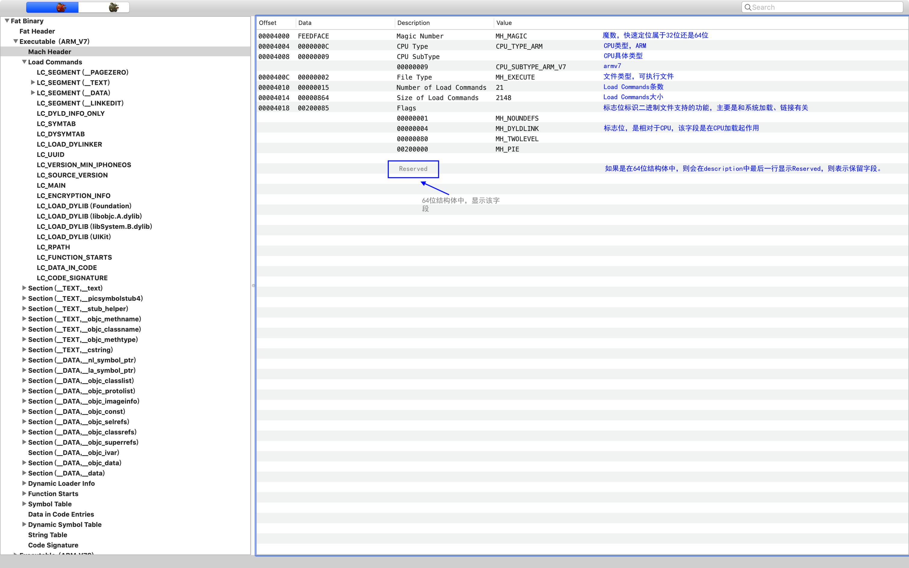 下图是关于Mach Header的字段解释,在图中都有标明,Mach Header在MachO文件中是比较重要的。