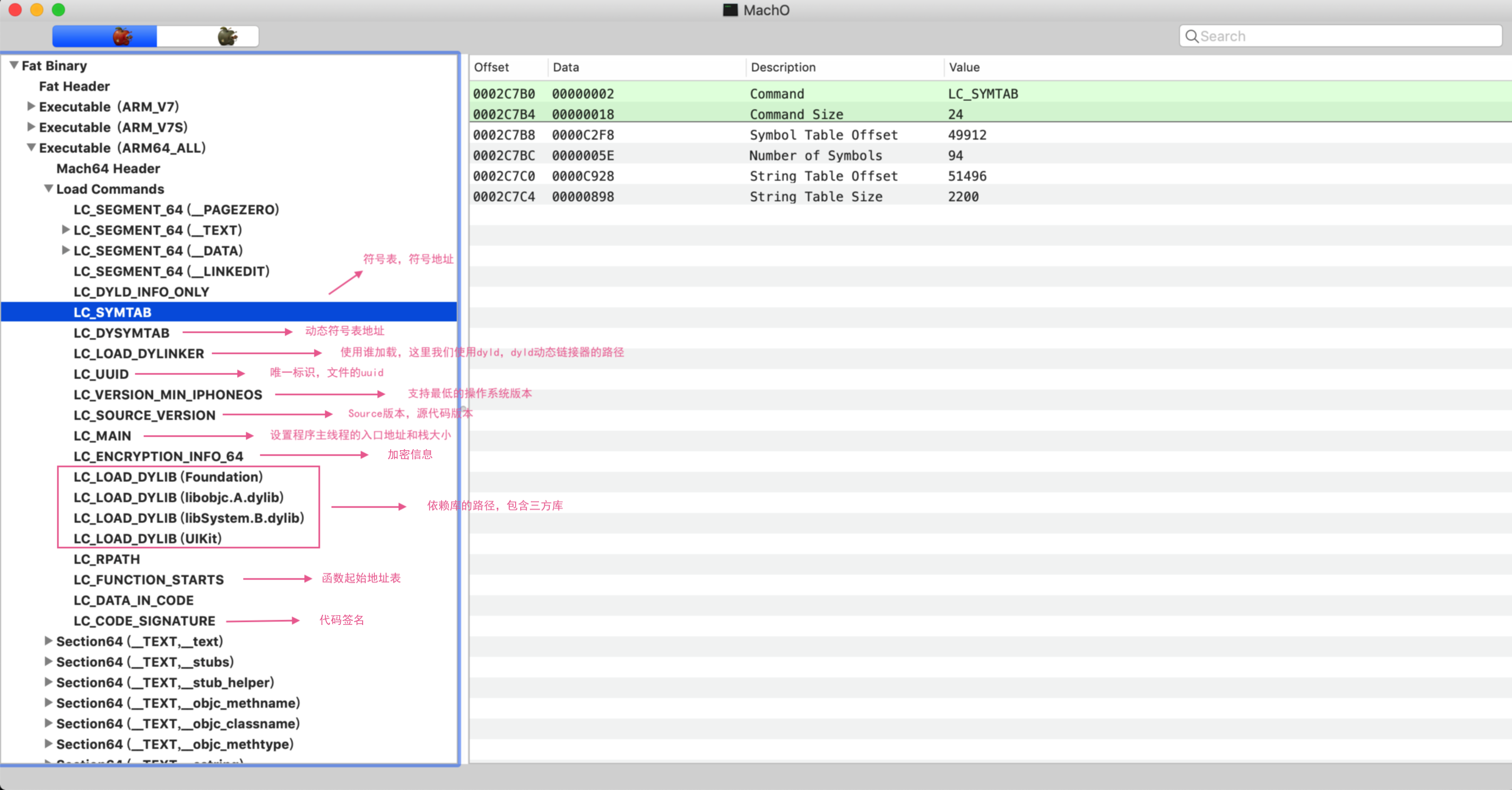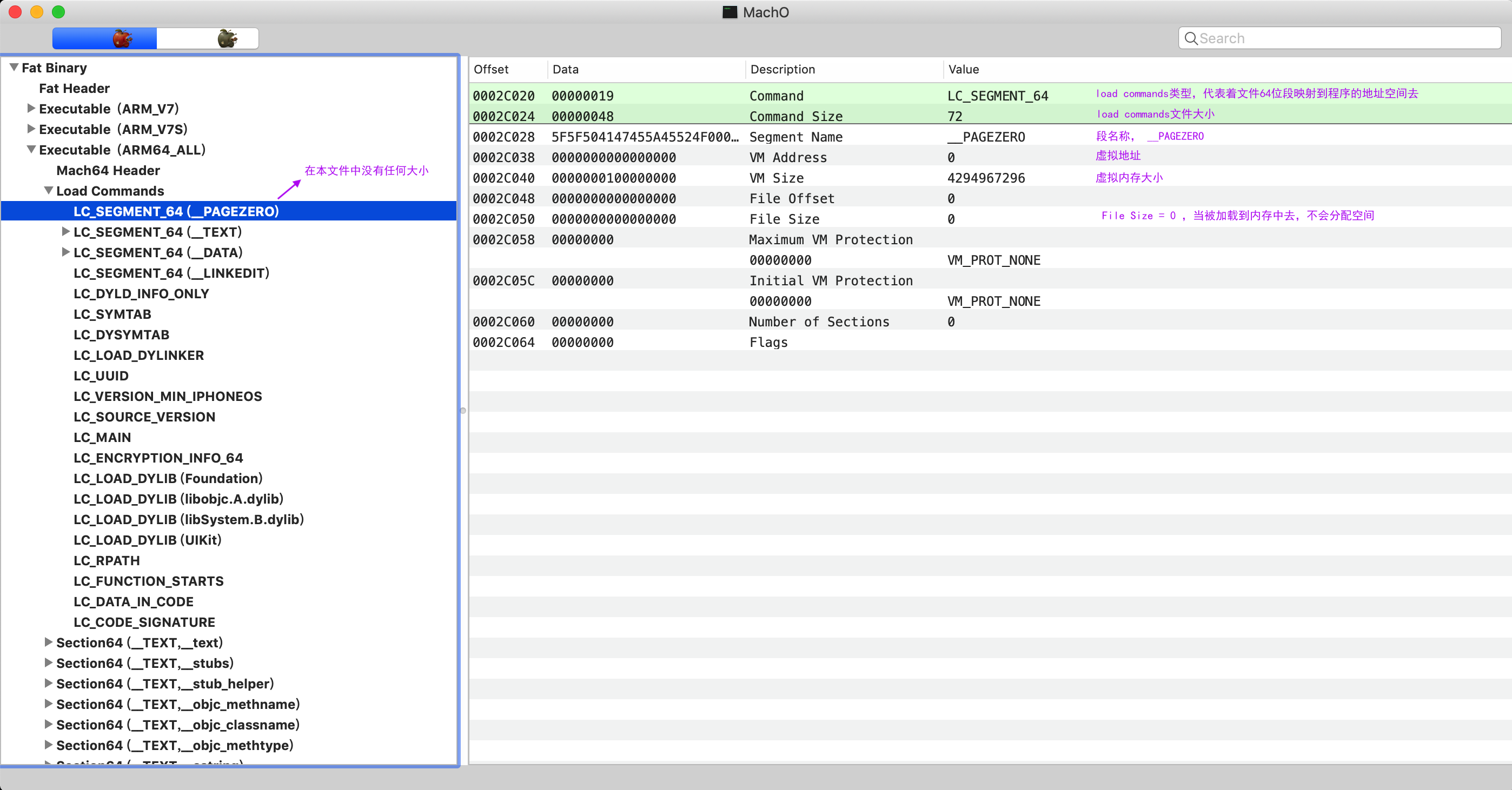 下图是Load Commands __PAGEZERO的一些标注,了解就好,并不作为重点