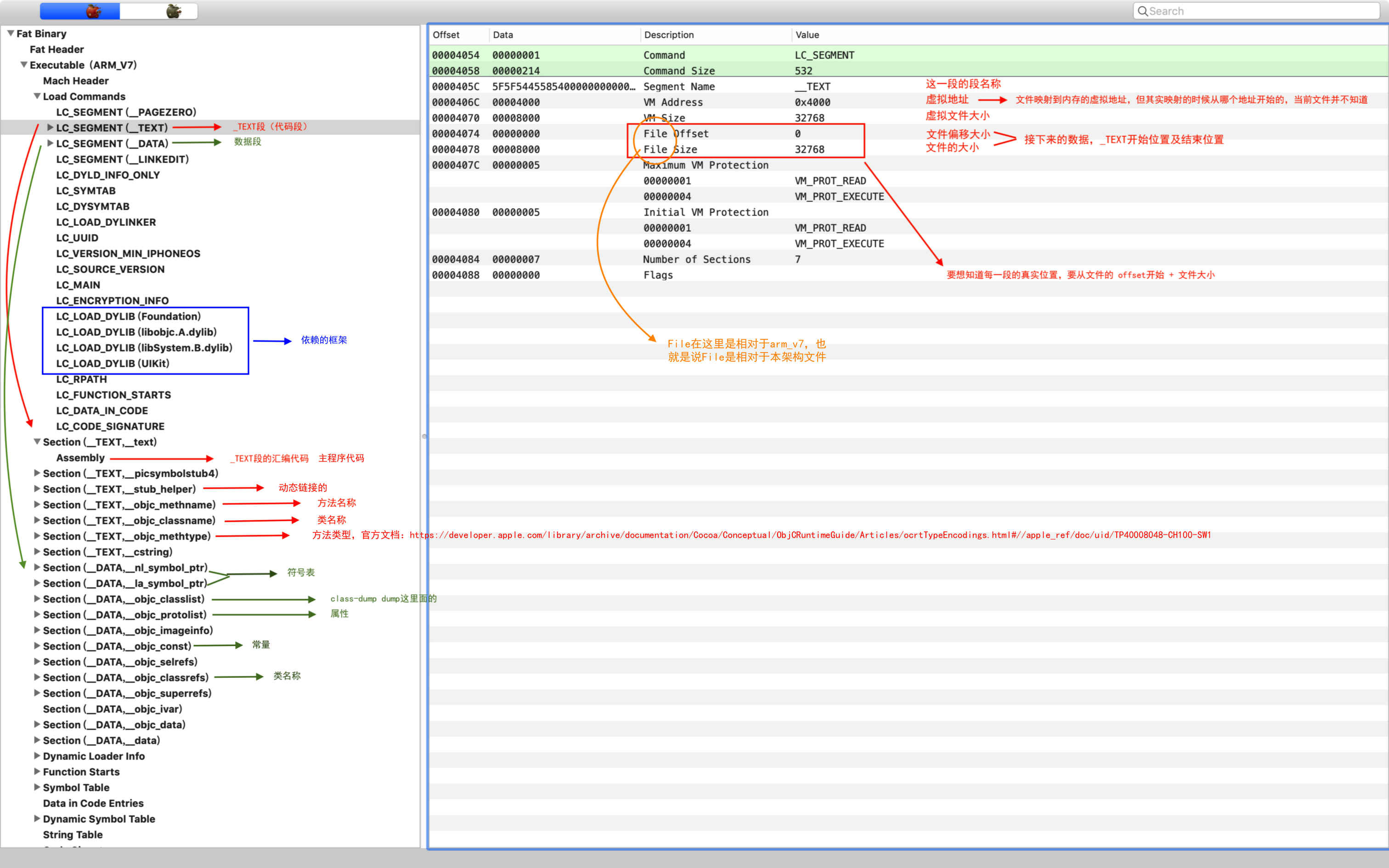 下图是Load Commands __TEXT段及部分__DATA(数据段)的部分标注, __TEXT段是比较重要的Segment,后期我们使用Hopper,大多都是解析 __TEXT(代码段)。