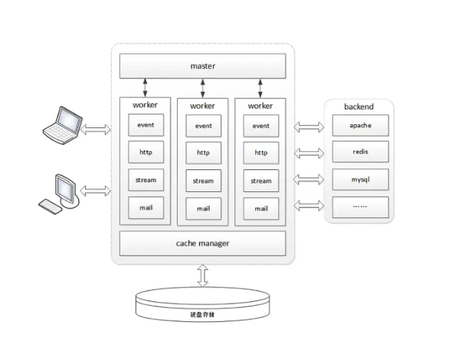 下图是Nginx的简要介绍:用一个Master进程来管理n个worker进程,每个worker进程仅有一个线程在执行。