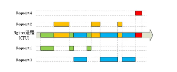 此外,web服务器有io密集型的特点(注意是io密集不是cpu密集),大部分的耗时都在网络开销而非cpu计算上,所以Nginx使用了io多路复用的技术,Nginx会将到来的http请求一一打散成一个个碎片,将这些碎片安排到单一的线程上,这样只要发现这个线程上的某个碎片进入io等待了就立即切换出去处理其他请求,等确定可读可写以后再切回来。这样就可以最大限度的将cpu的能力利用到极致。注意再次强调这里的切换不是线程切换,你可以把他理解为这个线程中要执行的程序里面有很多go to 的锚点,一旦发现某个执行碎片进入了io等待,就马上利用go to能力跳转到其他碎片(这里的碎片就是指的http请求了)上继续执行。