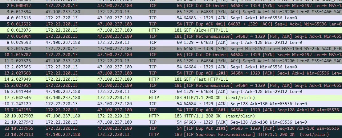 这里可以清晰的看出来,首先这2个http request 都是使用的同一条tcp连接, 都是源端口号60465到服务器1329. 然后看下time的时间,差不多0s开始发送了slow的请求,10s左右收到了slow的http response,然后马上 fast这个接口的request 就发出去了,过了5秒 fast的http response 也返回了。