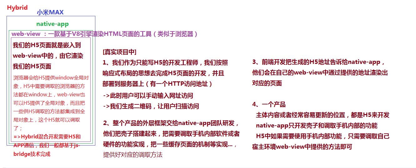 在native-App中嵌入H5页面(web-app),用户需要用到手机操作系统时,如摄像头等,实际上是通过jsBridge把信息传递给native-App,由其调取然后再把得到的信息反馈给H5页面