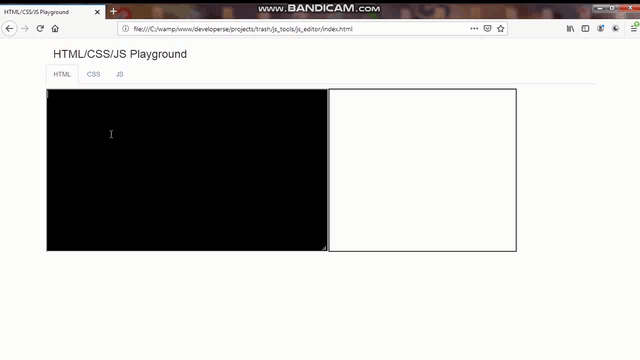 1 2 3 4 5 6 7 8 9 10 11 12 13 14 15 16 17 18 19 20 | const getEl = id => document.getElementById(id)const iFrame = getEl('iFrame').contentWindow.documentconst htmlTextArea = getEl('htmlTextarea')const cssTextArea = getEl('cssTextarea')const jsTextArea = getEl('jsTextarea')document.body.onkeyup = function() { iFrame.open() iFrame.writeln( htmlTextArea.value + '<style>' + cssTextArea.value + '</style>' + '<script>' + jsTextArea.value + '</script>' ) iFrame.close()} |