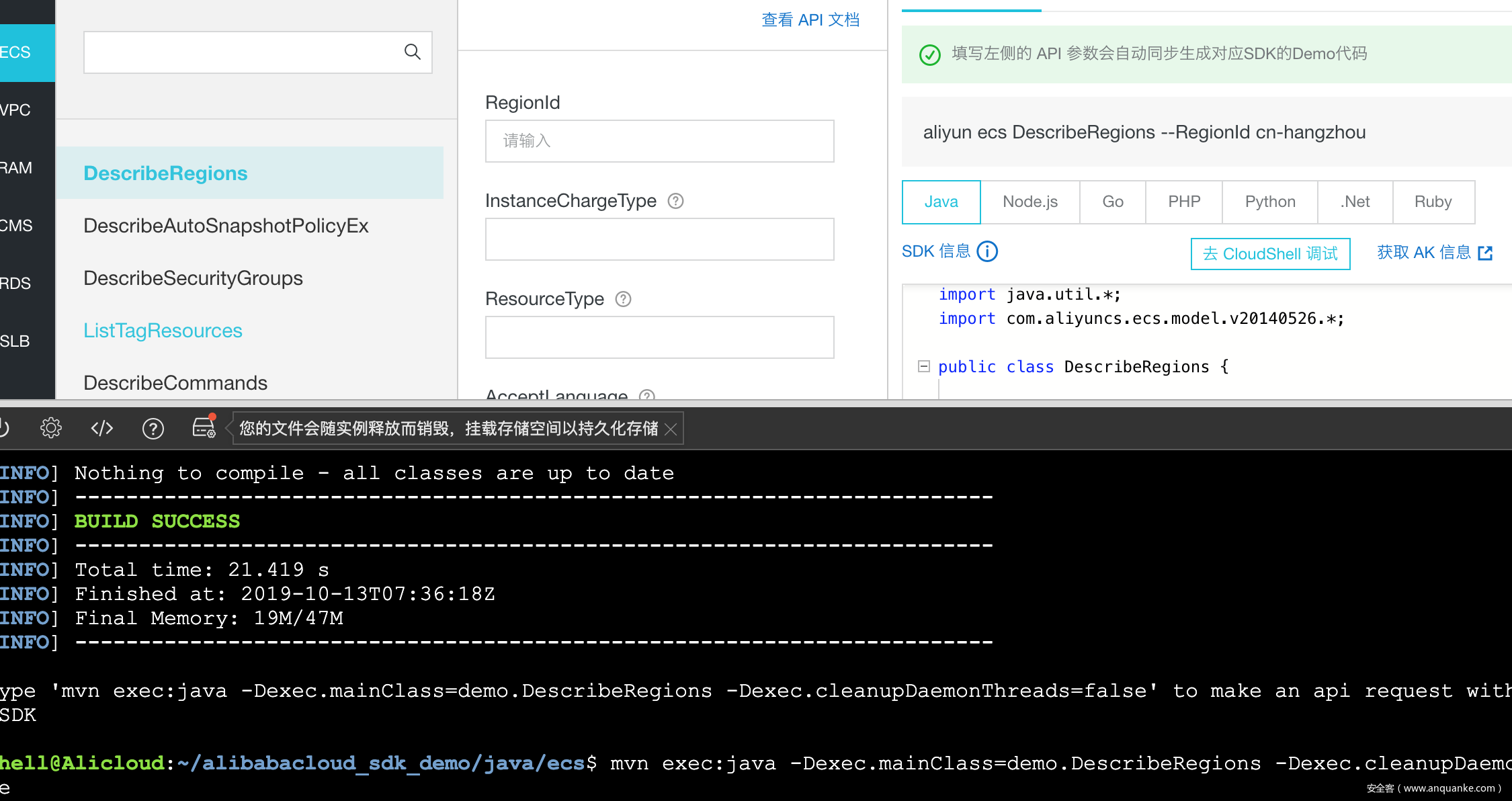 其中RegionId必填,地域ID,可以调用DescribeRegions查看最新的阿里云地域列表。