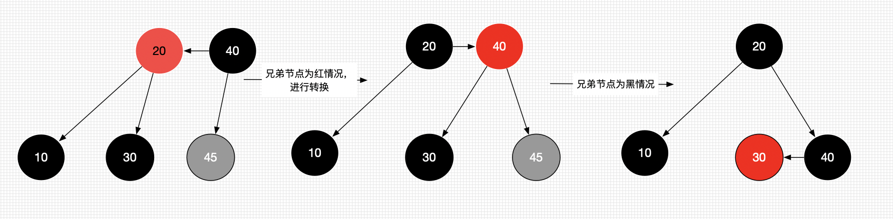 原理: 此时兄弟节点是20 。 我们要将30变为45的兄弟节点。然后在进行兄弟节点为black操作