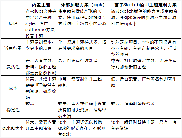 针对业内几种比较常用的主题定制方案与基于Sketch的UI主题定制方案进行了几个方面的对比: