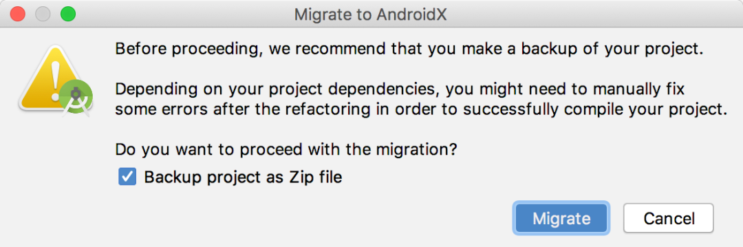 这里点击Migrate,Android Studio就会自动检查你项目中所有使用Android Support Library的地方,并将它们全部改成AndroidX中对应的库。另外Android Studio还会将你原来的项目备份成一个zip文件,这样即使迁移之后的代码出现了问题你还可以随时还原回之前的代码。