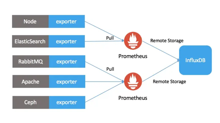 - InfluxDB远程存储可以实现“多写一读”的查询模式,多个prometheus对接同一个influxDB,允许联合查询多个Prometheus,实现数据“全局化”查询