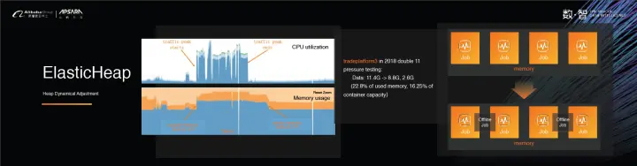 云栖大会上孤尽的演讲,清晰地描述了 ElasticHeap 的使用场景。在双 11 流量剧增的情况下,核心应用 tradeplatform3 迅速的回涨 Java heap 和内存,以保持高流量压力下的稳定。高峰过后,内存逐渐缩减。从集群维度来说,在线 Java 应用占据大量内存,即使在线流量低,cpu 利用率很低,由于内存的占据,集群机器的 cpu 资源依然无法复用。而 ElasticHeap 可以有效降低低压力的在线 Java 应用的内存占用,把内存资源出让一部分运行离线任务,从而突破在线应用集群的资源利用率的内存瓶颈。在本例中,节约了 22.8% 的 Java 进程的物理内存。