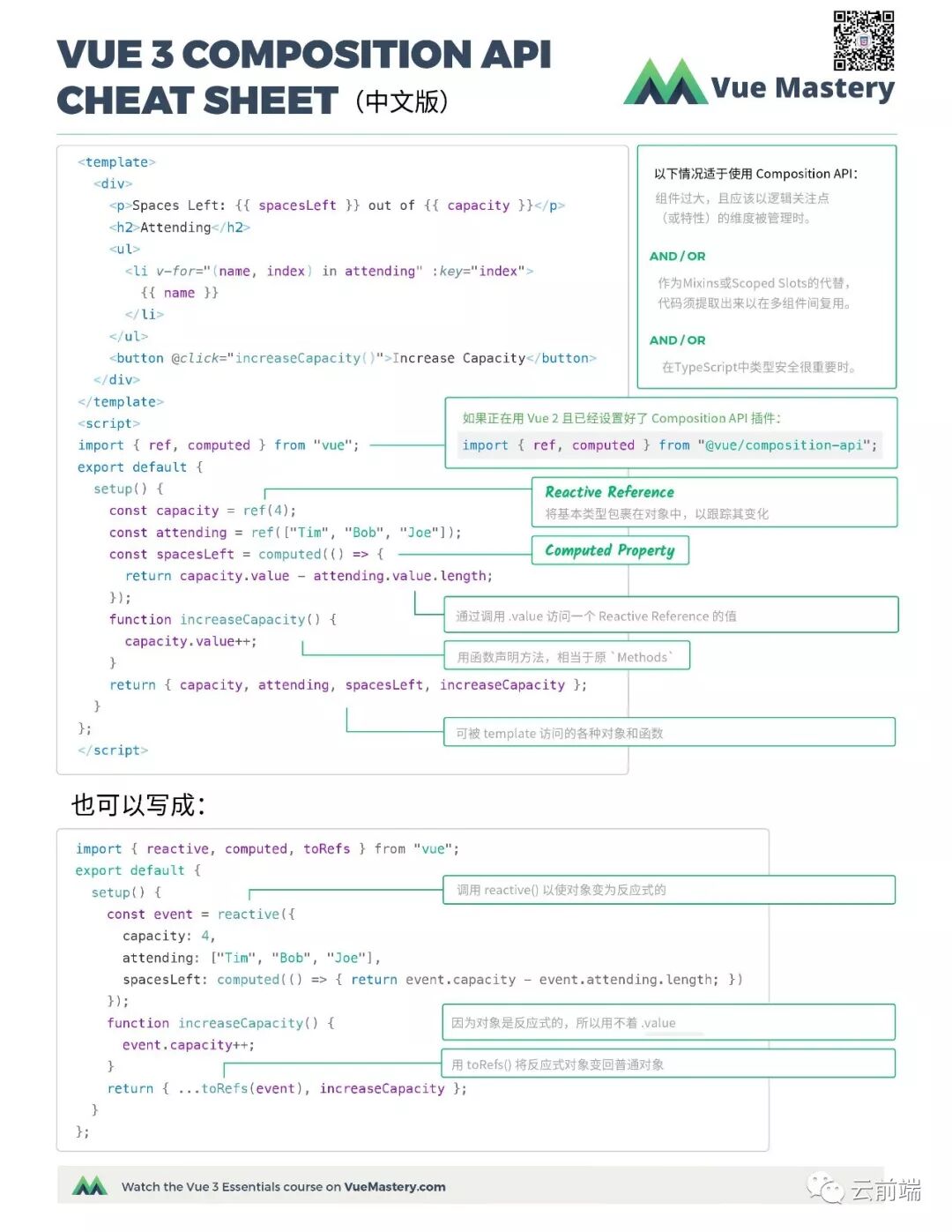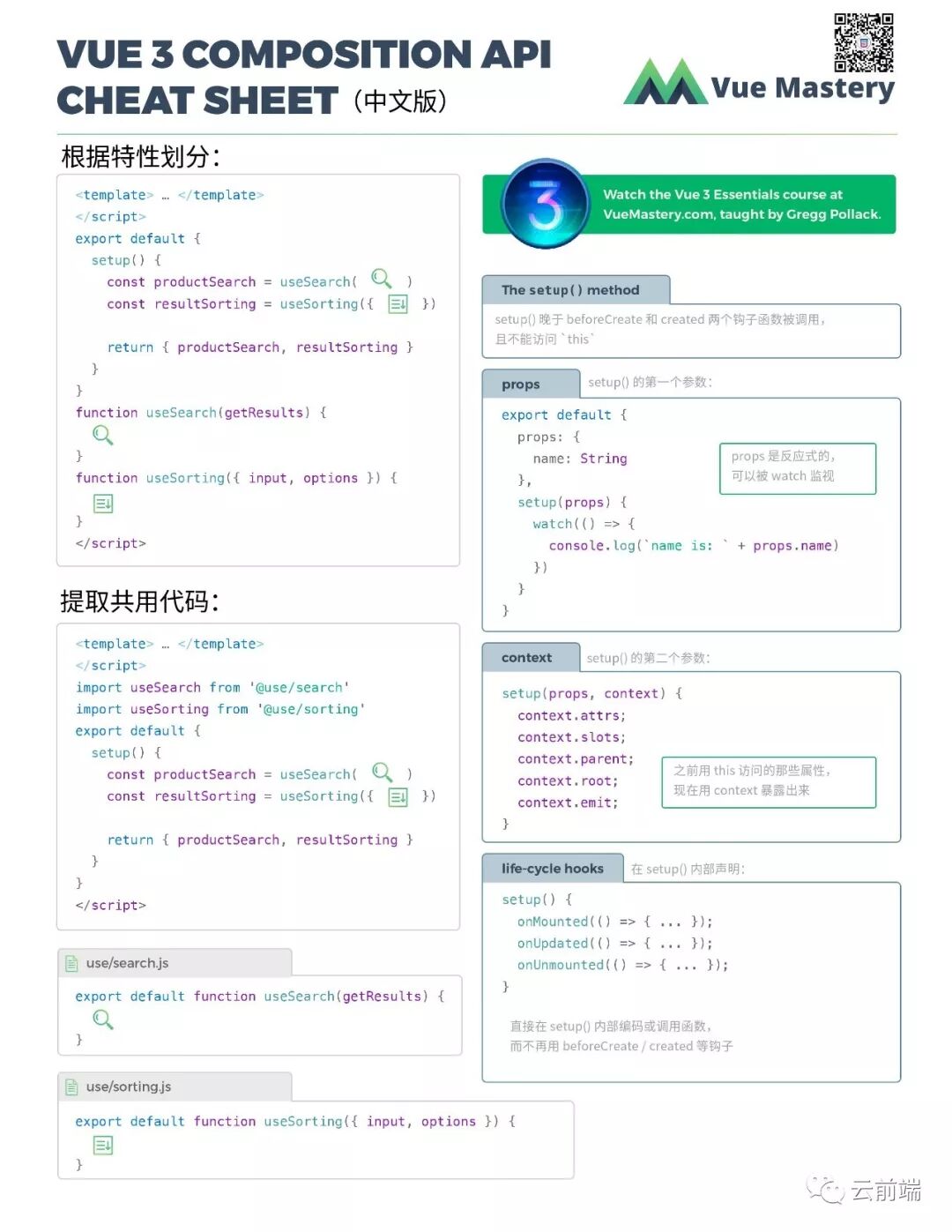 另外,由 Vue Mastery 网站归纳的 Vue 3 Cheat Sheet 直观的概况了其主要特性,翻译后的中文版如下: