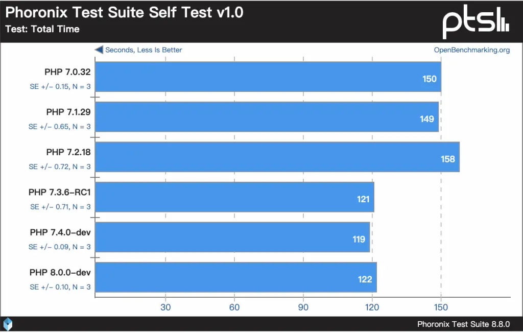 在此阶段,PHPBench的7.4性能与PHP 7.3稳定版相当,已经比PHP 7.0快了约30%…当然,与PHP 5.5的旧时代相比,收益甚至更大。