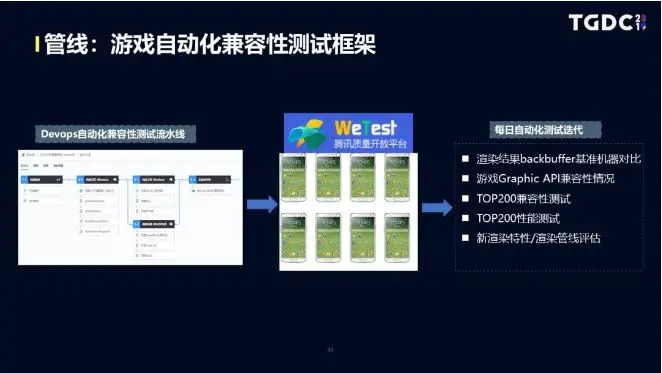 天美工作室群技术副总监郭智在9月由腾讯学院举办的第三届TGDC大会上分享引擎工作能力建设中,提到通过游戏自动化测试兼容性测试框架,能帮助他们解决不少问题,如解决了性能监控,引擎测试缺少特定的性能信息、干扰多,渲染管线耦合性较高、大量问题反复发作,bug上报不清等问题。