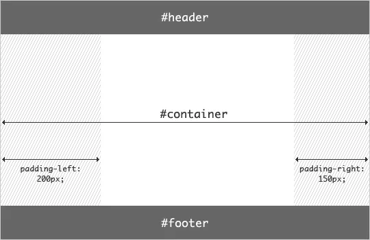 假设左侧的固定宽度为200px,右侧的固定宽度为150px,则首先在container上设置: