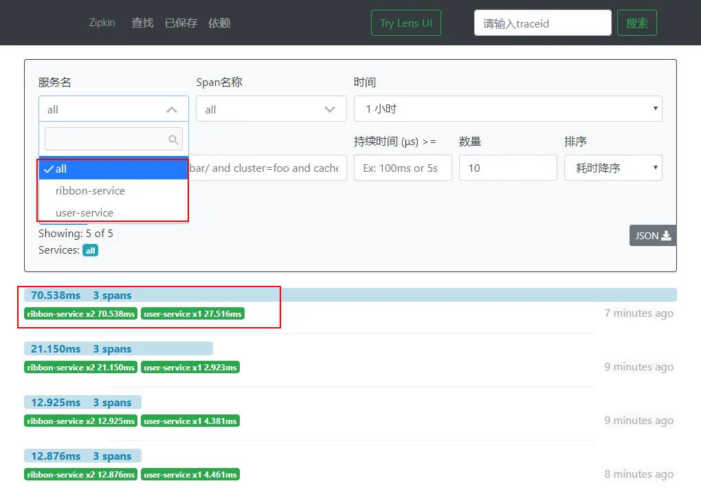 - 多次调用(Sleuth为抽样收集)ribbon-service的接口http://localhost:8301/user/1 ,调用完后查看Zipkin首页发现已经有请求链路跟踪信息了;