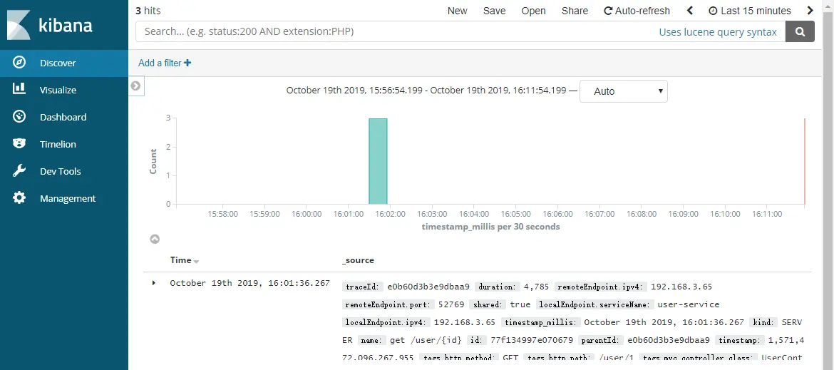 如果安装了Elasticsearch的可视化工具Kibana的话,可以看到里面已经存储了跟踪信息: