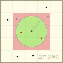 令左图的中心为搜索中心,绿色圆形区域为目标区域,所有点为待搜索的位置对象,红色点则为满足条件的位置对象。