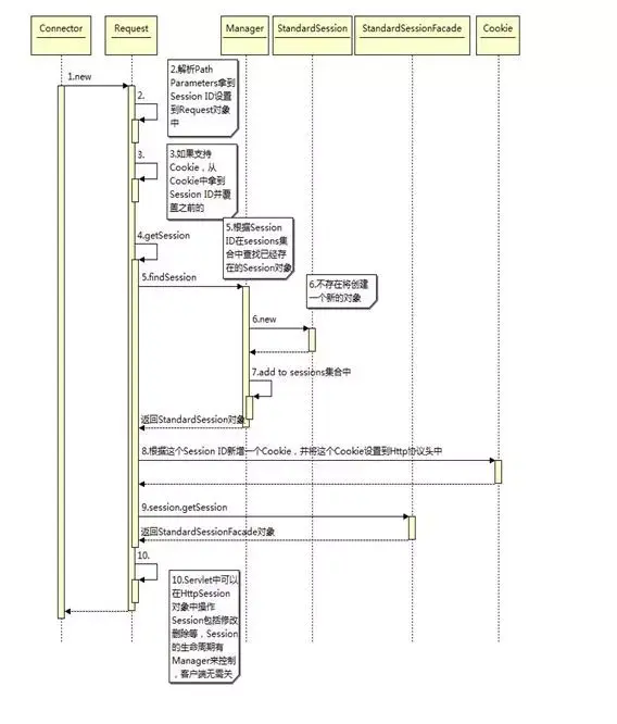 上从图中可以看出从 request.getSession 中获取的 HttpSession 对象实际上是 StandardSession 对象的门面对象,这与前面的 Request 和 Servlet 是一样的原理。下图是 Session 工作的时序图:
