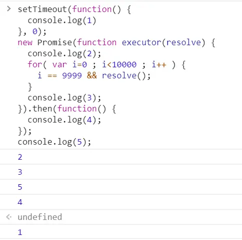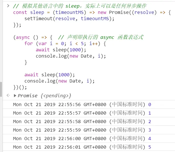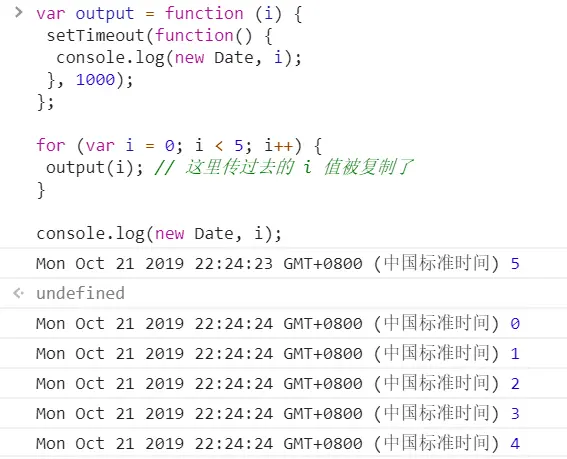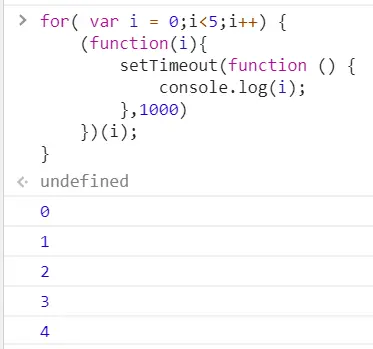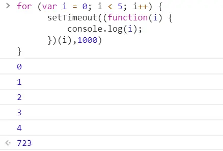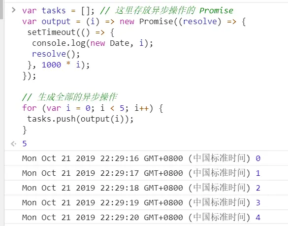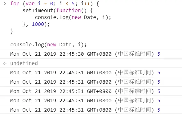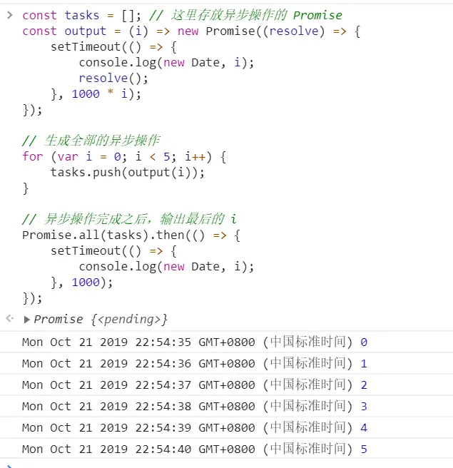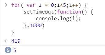 异步 Iridescent_up 2019-10-21 146 阅读1分钟 关于setTimeout的面试题 1. 牛刀小试 2. setTimout在for里面是异步执行的,在延迟输出的时候,i的值已经是5了,因此会输出 5,5,5,5,5 3. 采用闭包的方法,将里面的i值保存下来;结果就是 01234 4. 有点像闭包的样子了,但是我们需要的i的值依旧没有传进即时函数,没有保持对i的引用,依旧会将i的值加到5,输出也就是,5,5,5,5,5 5. setTimeout里面传入一个即时函数,传入i,即时函数会输出01234的,这里的效果就是不会等待1s 了,会立即输出01234 但是在浏览器中会出现这么一个数字或者字符串是啥意思呢? 这是是因为定时器的 执行后会返回一个ID ,这个数字就是定时器的ID 6. 7. 8. 9. 追加代码笔记:es7的异步处理模式 10. 11. 12.