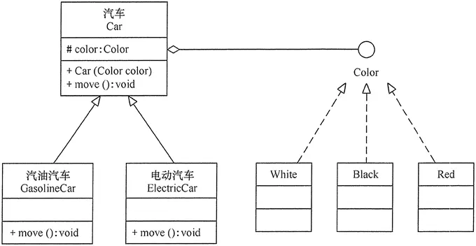 汽车按“动力源”划分可分为汽油汽车、电动汽车等;按“颜色”划分可分为白色汽车、黑色汽车和红色汽车等,通过组合关系实现多种动力、多种颜色的定义。