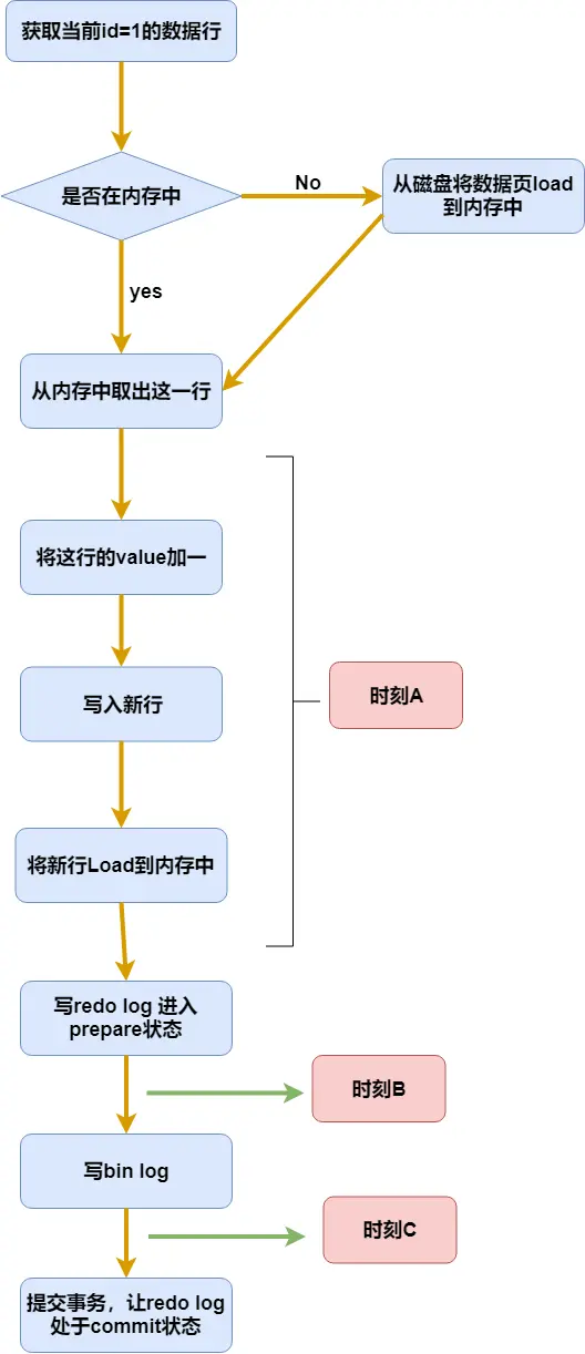 - 时刻C:此时 bin log 已经写盘,redo log 已写盘并处于 prepare 状态,此时事务会根据 redo log 和 bin log 继续提交。