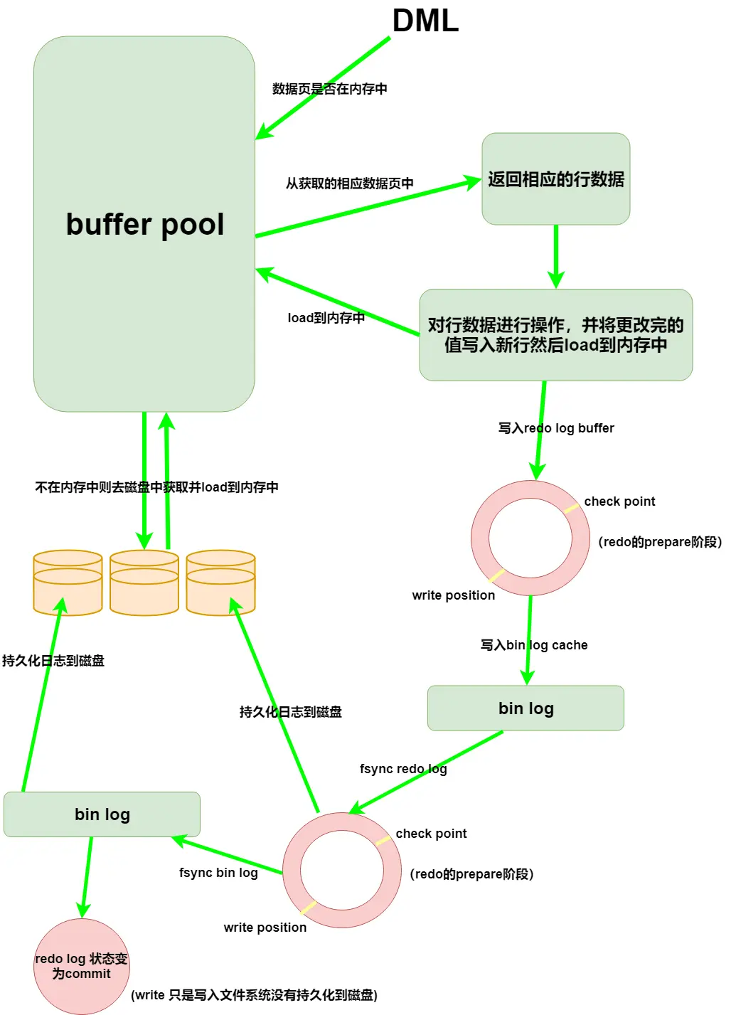 总的来说就是 MySQL 在进行 DML 语句的时候会先写日志缓存(为了事务多个 DML 语句而不多次进行写盘操作),等到事务提交的时候会进行日志的真正落盘(“双一配置”),其中还使用了两阶段提交加上redo log的两种提交状态来实现 crash-safe能力 和 redo log,bin log 的同步。