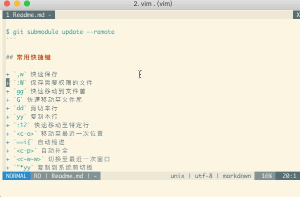 :w快速保存<C-[>退出 insert 模式,与esc类似0快速移动到行首gg快速移动到文件首G快速移动至文件尾<c-o>移动至最近一次位置zz把光标移动至本屏中间:12快速移动至特定行dd剪切本行yy复制本行yi{复制括号中内容=i{自动缩进<c-p>自动补全"*yy复制到系统剪切板*快速查找关键字,类似于sublime/vscode 的Command + d:noh取消关键字高亮o快速进入 insert 模式,并定位到下一行u撤销
