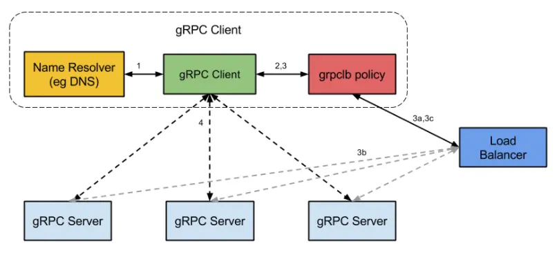 可以看到,load balancer与grpc server通信,获得grpc server的负载等具体详细,然后grpc client从load balancer获取这些信息,最终grpc client直连到被选择的grpc server。