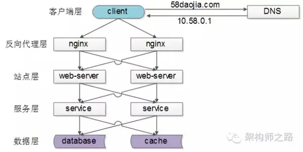 常见互联网分布式架构如上,分为客户端层、反向代理nginx层、站点层、服务层、数据层。可以看到,每一个下游都有多个上游调用,只需要做到,每一个上游都均匀访问每一个下游,就能实现“将请求/数据【均匀】分摊到多个操作单元上执行”。