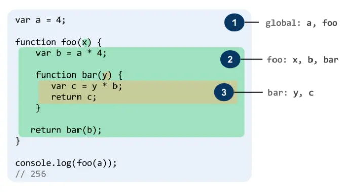 01 02 03 04 05 06 07 08 09 10 11 12 | let value = 1function foo() { console.log(value)}function bar() { let value = 2 foo()}bar() // 1 |
