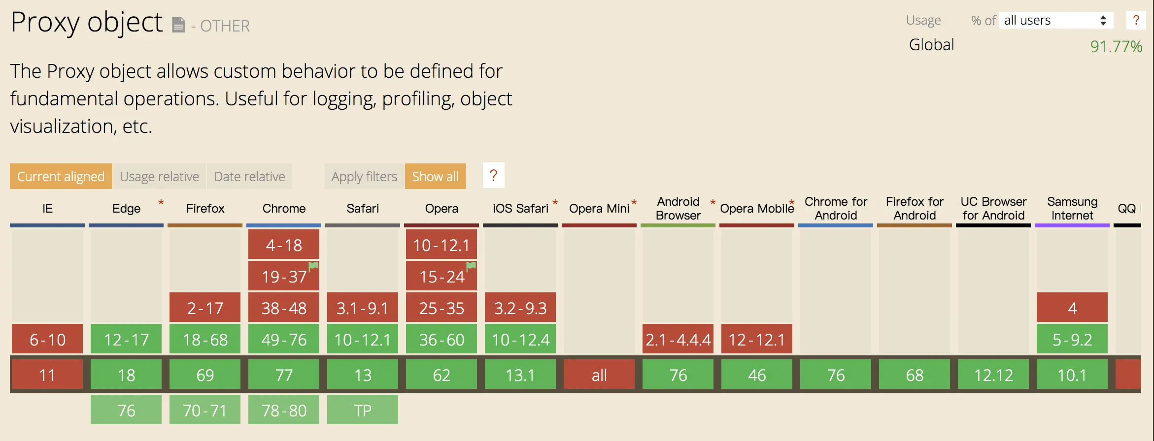 Proxy为ES6新出的API,浏览器的对其支持情况可以在caniuse查到,如下图所示: