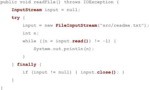 try (InputStream input = new FileInputStream("readme.txt")) {