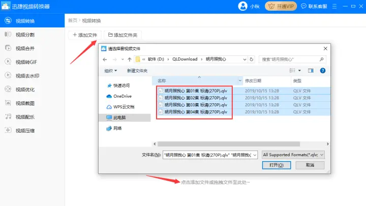 2、然后把要转换的qlv格式的视频批量添加到转换器中,添加的时候可以点击左上角的添加文件夹按钮,也可以把要转换的视频拖拽到软件空白处。
