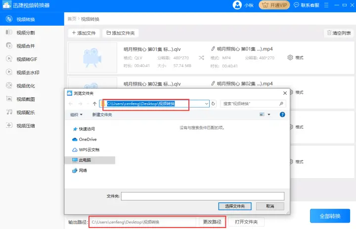 5、以上都设置完后就可以点击全部转换开始把qlv格式转成mp4并输出到指定的路径中,等待片刻视频转换好后就可以到输出路径找到并打开文件了。