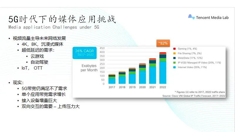 视频流量一直是占领网络流量的先驱,在5G趋势下会只增不减。思科公司预测的2017年到2020年全国以IP为基础的视频流量百分比,到2020年视频流量百分比可以达到82%,到2020年82%的流量是视频传输,包括视频会议、小视频、云游戏类似的服务。