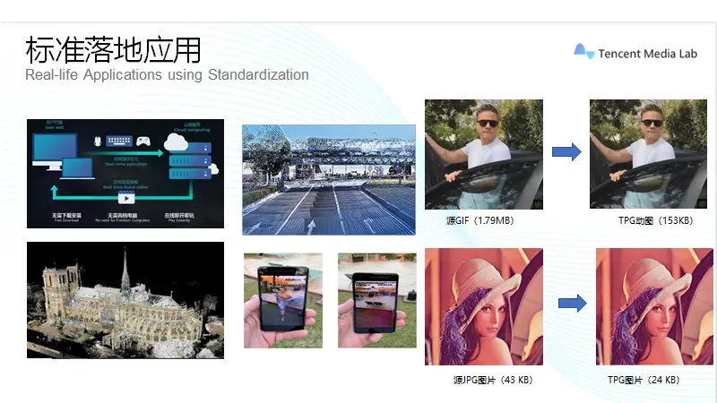 云游戏是视频压缩技术很大的应用场景,包括前面说的IETF里包括QUIC等很多网络传输标准。你的游戏安装都在云端,云端把游戏渲染,渲染之后以视频形式通过网络传输给客户端,客户端不需要维护、下载、安装游戏,也不需要打补丁,服务器已经帮你处理完,你需要的是像看一个电影一样玩游戏,这是非常不一样的游戏用户体验。另外,多媒体实验室研发的TPG图片压缩技术,从主观上分不出区别的前提下文件数量少了十几倍,这使文件传输到云端会减少很多带宽。
