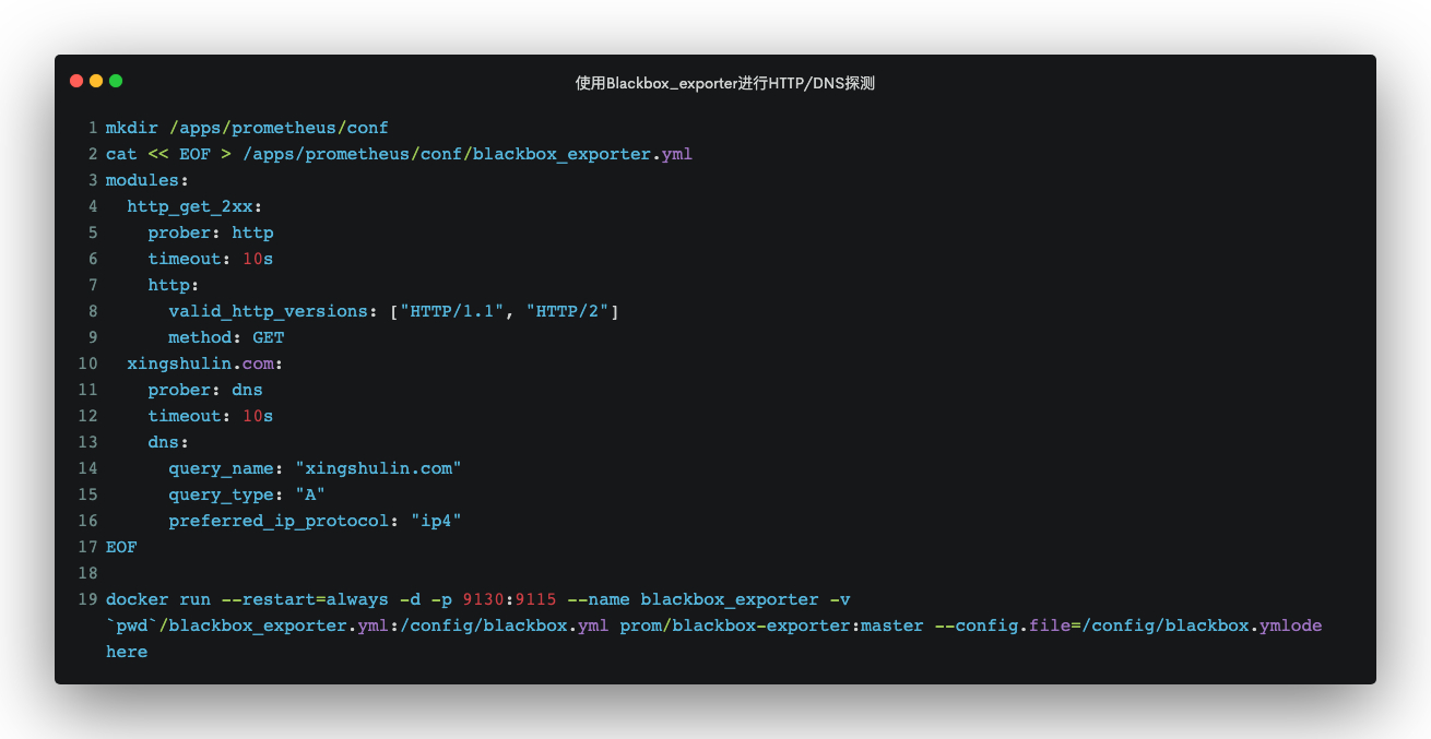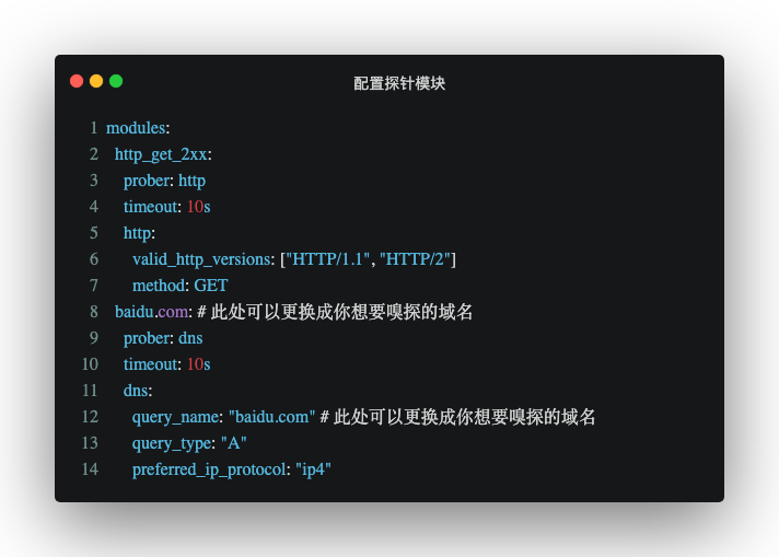 首先我们应该准备一个探针模块作为blackbox_exporter的配置文件blackbox_exporter.yml,这里我们使用HTTP、DNS两个模块作为演示案例