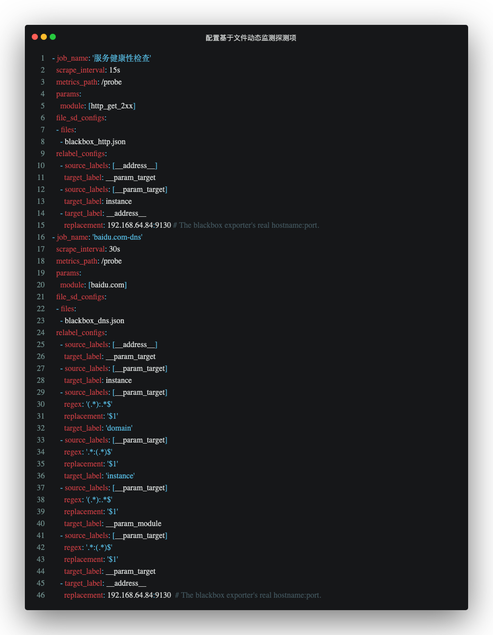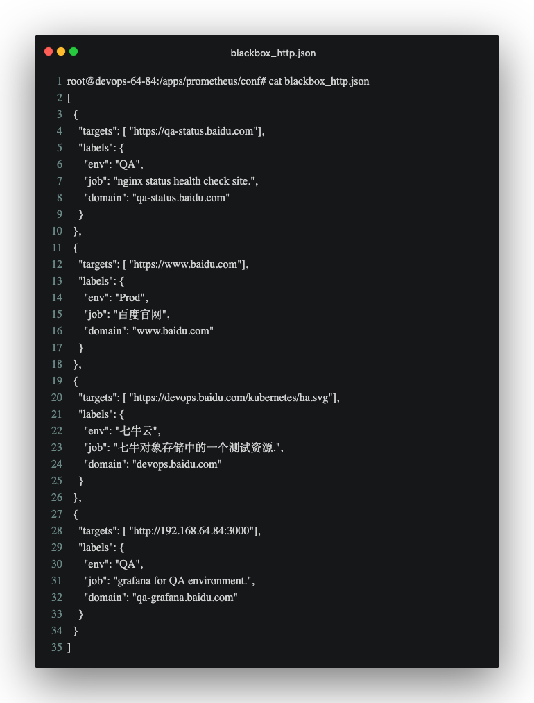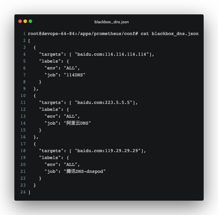 仔细看一下prometheus的配置文件,我们会发现检查项都是通过动态文件来发现的,其中blackbox_dns.json用于发现待需检查的域名,blackbox_http.json用于发现使用http模块嗅探服务正常的配置文件,下面我们需要在prometheus的配置文件的同级目录下加入这两个文件。