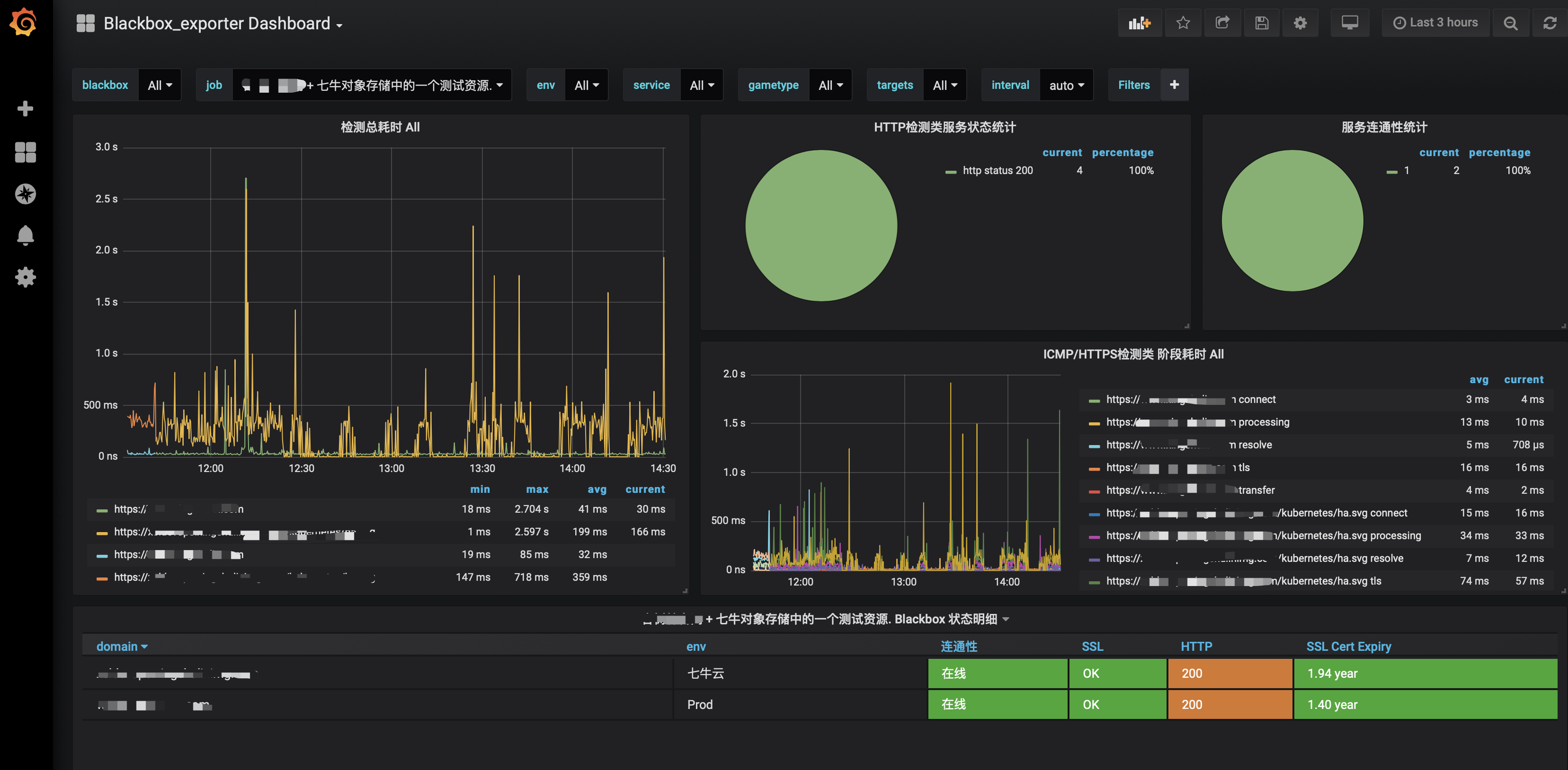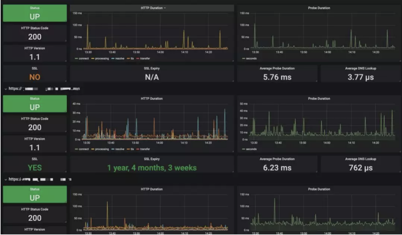 这样的话,我们就可以判断服务是否还在正常的工作,网站有没有出现不可访问,站在用户的角度上进行对服务资源监控。当然这里还可以对支持https的证书的有效期进行监控,看下图,有两个域名的证书还有一年半的时间到期。只要数据采集到了,我们就可以通过数据进行有效的告警,不用专门的再去写拓展服务区监控证书到期时间了。