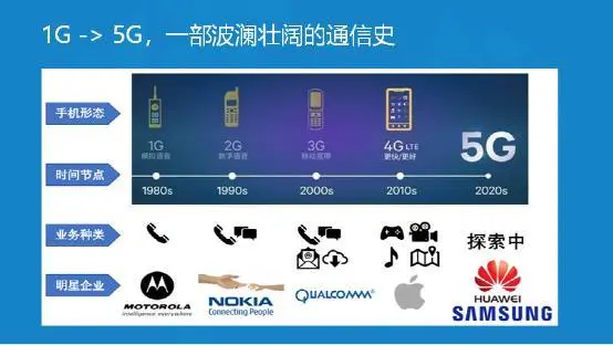 1G到5G的变化,是一部波澜壮阔的通信史。如下图所示,我们可以从不同维度俩看待这个发展过程,如手机形态、时间节点、业务种类、明星企业。