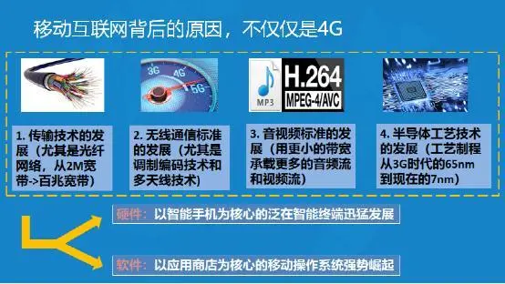 移动互联网发展背后的原因,不仅仅是4G技术的推动。还包括传输技术的发展(尤其是光纤网络,从2M宽带->百兆宽带)、无线通信标准的发展(尤其是调制编码技术和多天线技术)、音视频标准的发展(用更小的带宽承载更多的音频流和视频流)、半导体工艺技术的发展(工艺制程从3G时代的65nm到现在的7nm)。