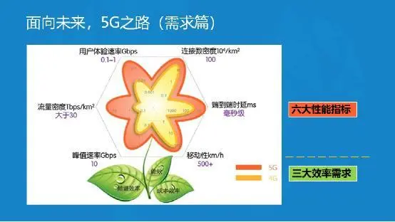 如下图所示,5G有六大性能指标:用户体验速率、链接数密度、流量密度、端到端延时、峰值速率、移动性。另外有能效、频谱效率和成本效率三大效率需求。备注:下图引用IMT-2020推进组的5G需求。