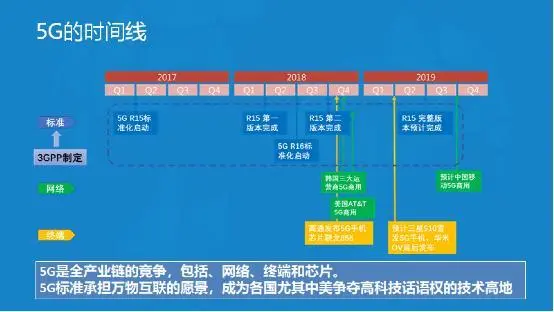 我们来从标准、网络、终端设备来看5G技术的时间线。如下图所示,5G标准启动是2017年年初甚至2016年年底,2018年5月份左右第一个版本完成,下面是5G R16,相当于5G第二个版本。去年年底美国和韩国开始5G商用。当时韩国还为了抢5G首发国,临时提早一天,确保在美国AT&T之前搞5G商用。