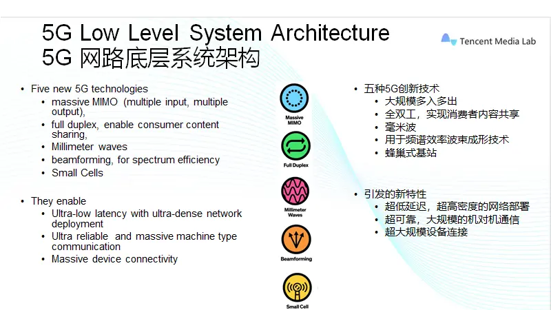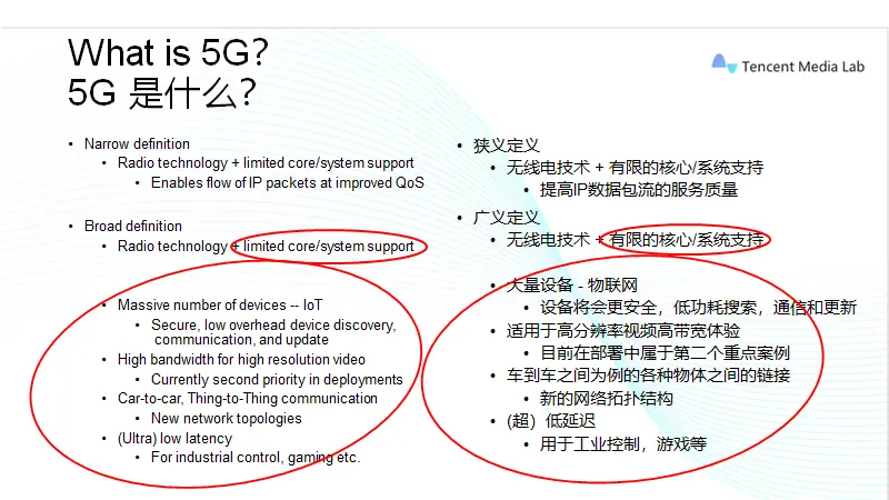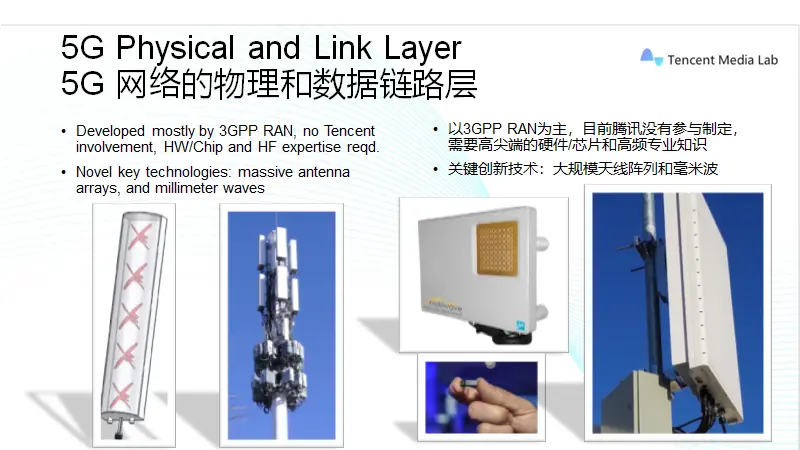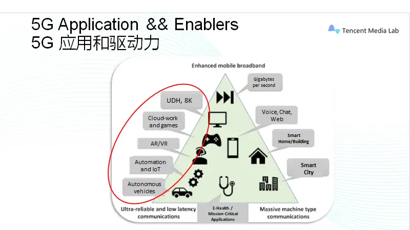 第三个,可靠性、低延时。可靠性,可用于一些重要的应用产品,比如无人驾驶,可靠性比较很高。低延迟,红色圈注的是腾讯目前重点关注的领域(见PPT),8K、AR/VR、自动驾驶、物联网、IoT,对低延迟有很高的要求,这是5G标准给我们带来的新特性举例。