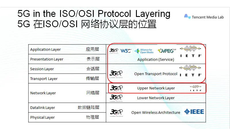 这是从上往下说,3GPP在应用层是分量最小的。我们身边接触的所有计算机网络协议都是在IETF里制定的。在ISO中,3GPP 5G标准在应用层占的份额很少;在Transport 层中3GPP占很大分量。往下是数据链路层、物理层。 IEEE则会制定一些物理层5G标准协议。(后面会有简要介绍都是有哪些协议)。IETF和3GPP合作共同完成5G在传输层一些协议制定;腾讯参与5G制定和IETF、3GPP的一些活动包括网络层、传输层,应用层中包括对动态图像、数据压缩、图像压缩的应用。
