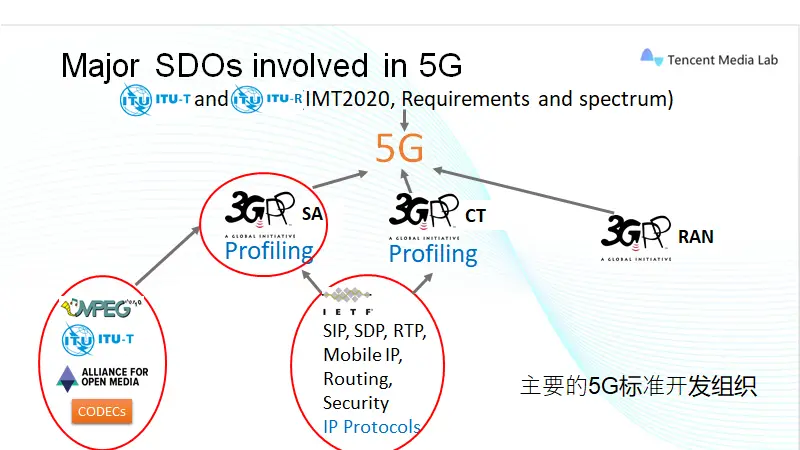 上图左边看是MPEG,负责多媒体,在视频压缩、视频传输的标准制定,这块多媒体实验室投入的人力和资源非常大,产出也非常出色。另外一个是CODEC,是3GPP跟ITU-T共同合作的。网络协议在5G中的应用比如SIP、SDP主要跟IETF合作。