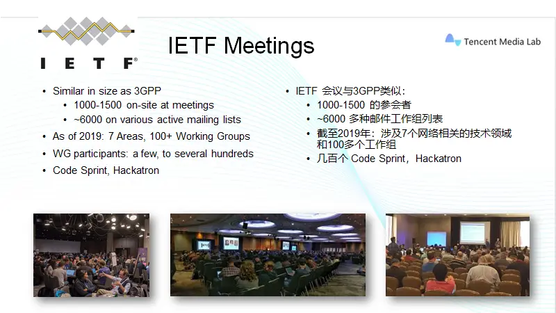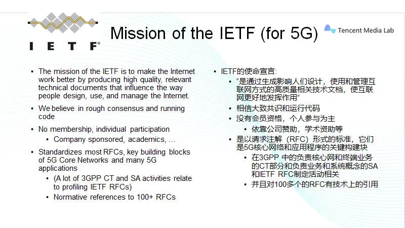 IETF组织跟其他组织不太一样,它相信大致共识,就是会场里不是所有人都同意,大部分人同意就可以,而且你所提出的提案必须大部分有代码支持,有一定的实现才可以,它没有会员资格,个人参与为主,大部分是公司赞助、学术资助等等。5G主要是在3GPP里制定,核心的部分CT和SA跟IETF有紧密合作。