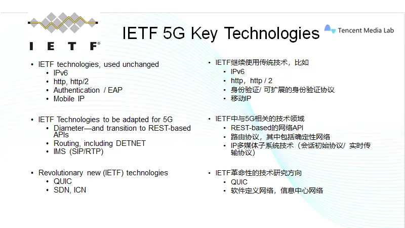 在5G制定过程中,IETF继续使用传统技术,比如IPv6、HTTP,HTTP/2、身份验证/可扩展的身份验证协议、移动IP。IETF中与5G相关的技术领域:REST-based的网络API、路由协议,其中包括确定性网络;IP多媒体子系统技术(会话初始协议/实时传输协议)。IETF革命性的技术研究方向包括QUIC、软件定义网络,信息中心网络等也将会在5G标准制定的考虑范围内。