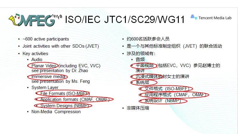 MPEG每次大概会有约600名活跃参会人员。它是一个与其他标准制定组织(JVET)的联合活动;涉及的领域有:音频、平面视频(包括EVC,WC);沉浸式媒体;系统层,文件格式(ISO-MBFF)、应用程序格式(CMAF,OMAF)、系统设计(NBMP);非媒体压缩)。